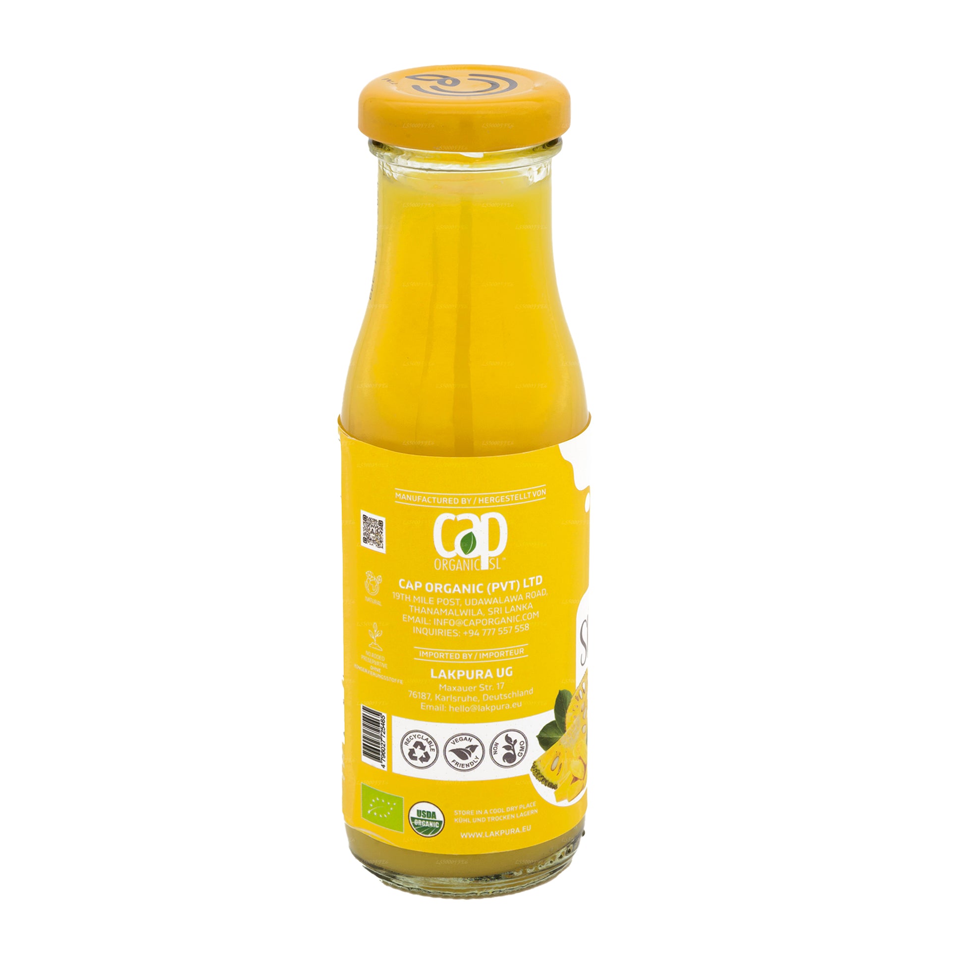 CAP Ceylon Jackfruit Shot är en ren jackfruktdryck som erbjuds i en 200 ml glasflaska med ett säkerhetsmetalllock. Den kombinerar naturlig jackfruktmassa med precis tillräckligt med socker och genomgår pastörisering för säkerhet och livslängd. Fri från konserveringsmedel upprätthåller den fruktens näringsfördelar, inklusive fiber och vitaminer. Njut av den unika smaken och hälsofördelarna med jackfrukt med en hållbarhet på 18 månader