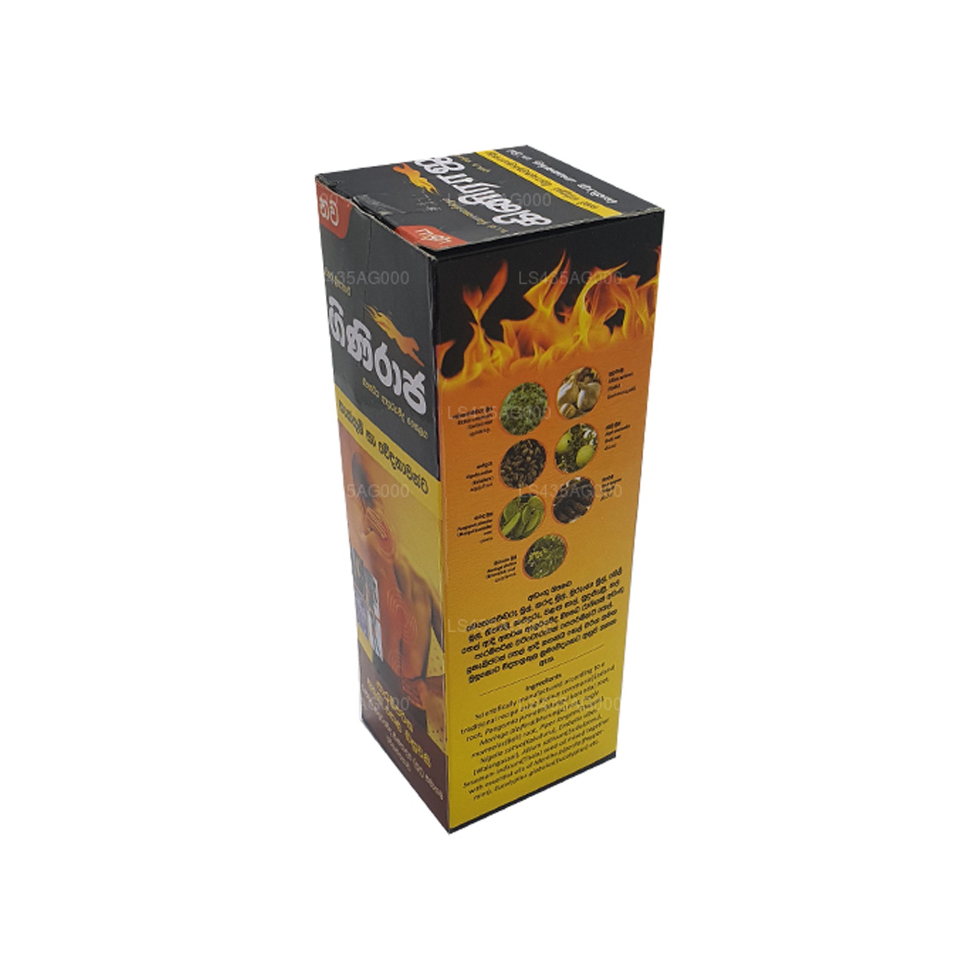Chandanalepa Giniraja smärtlindrande örtolja har tillverkats med en blandning av naturliga örter och botaniska extrakt inklusive Icinus communis (Endaru) rot, Pongamia pinnata (Mangul karanda) rot, Moringa oleifera (Murunga) rot, Aegle marmelos (Beli) rot, Piper longum (Thippili), Nigella sativa (Kaluduru), Embelia ribes (Walangasaal), Allium sativum (Vitlök), Sesamum indicum (Thala, Sesam) fröolja blandad med eteriska oljor av Mentha piperita (Pepparmynta), Eucalyptus globulus (Eucalyptus) etc. Observera att denna olja är avsedd för yttre Använd endast och vid användning bör du följa instruktionerna som medföljer lådan.