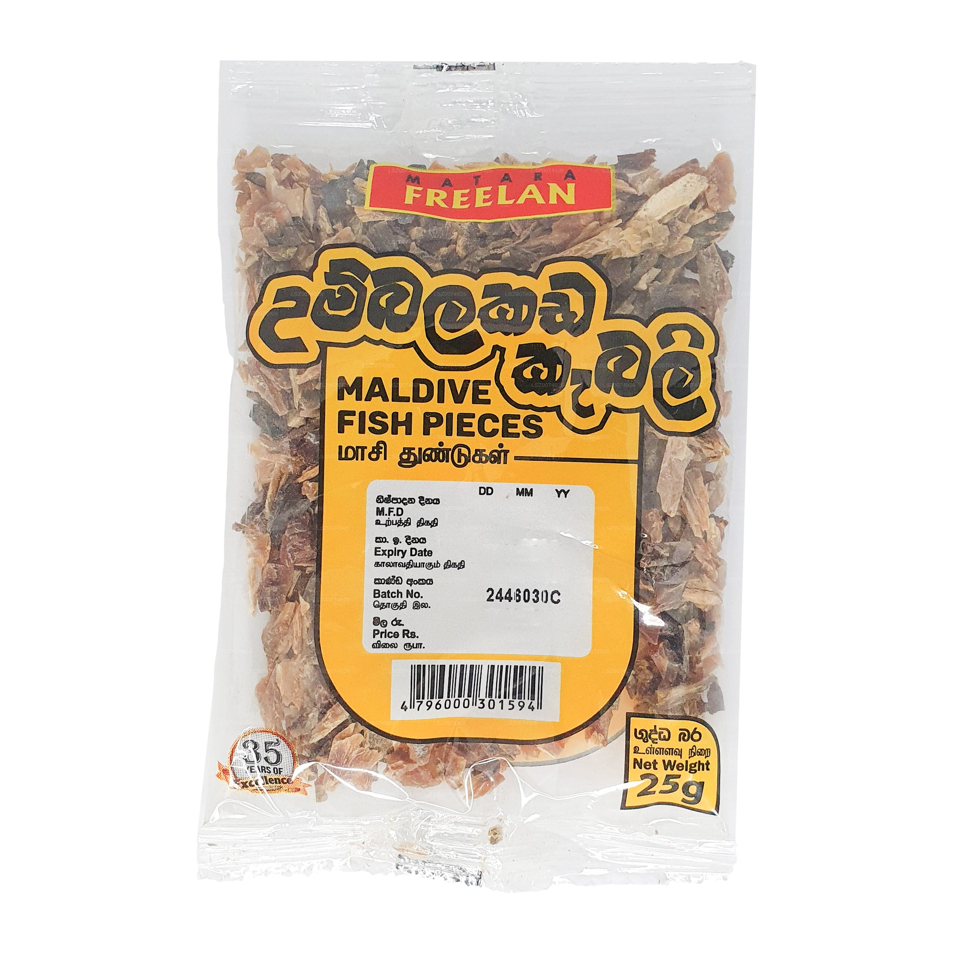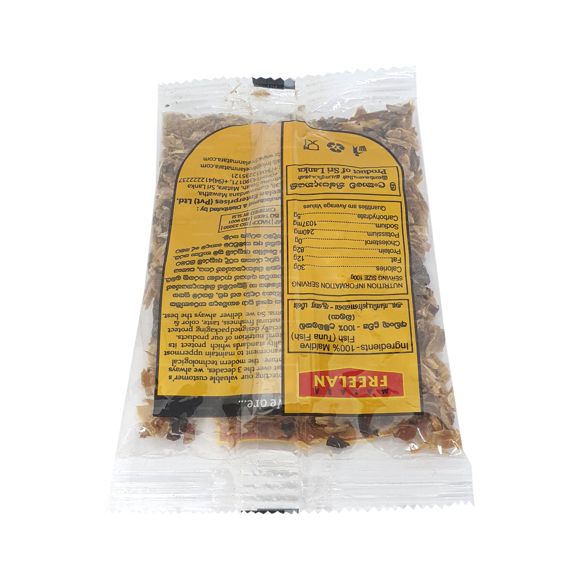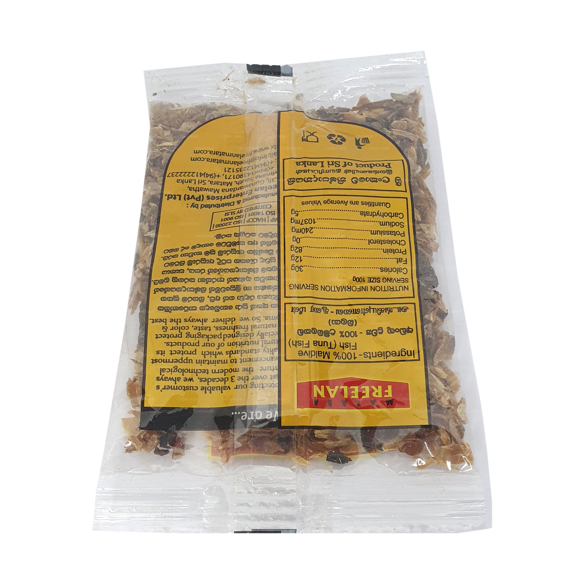 Freelan Maldive Fish Pieces offer a savory and authentic taste of the Maldives. With a 25g pack, these fish pieces are a staple ingredient in Maldivian cuisine. Derived from sun-dried tuna, they are rich in umami flavor, adding depth to various dishes. The small, flavorful pieces can be used to enhance curries, sambols, and other traditional preparations. Freelan Maldive Fish Pieces are a convenient way to bring the distinctive taste of the Maldives to your culinary creations, offering a genuine and versatile ingredient that reflects the essence of this unique island nation's cuisine.