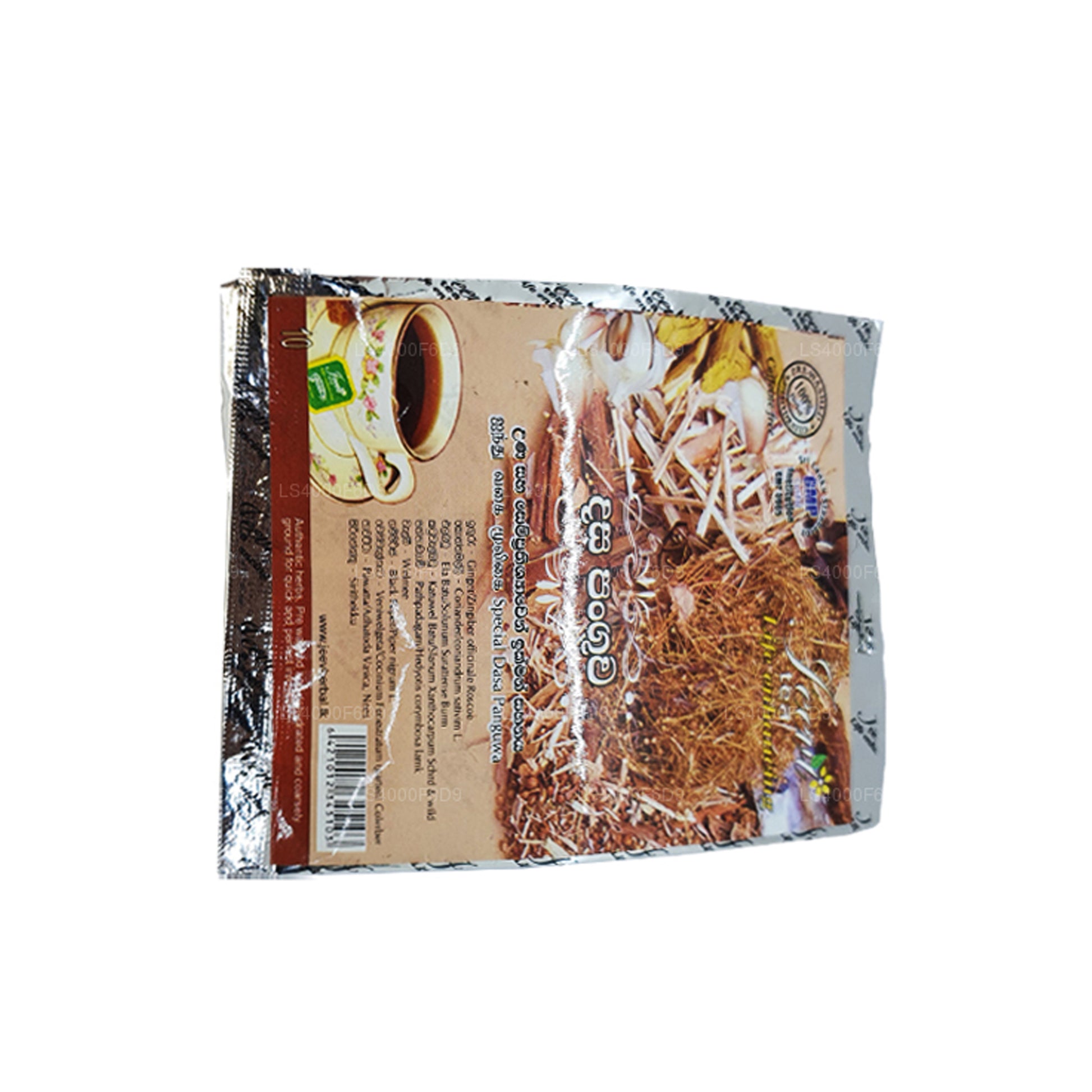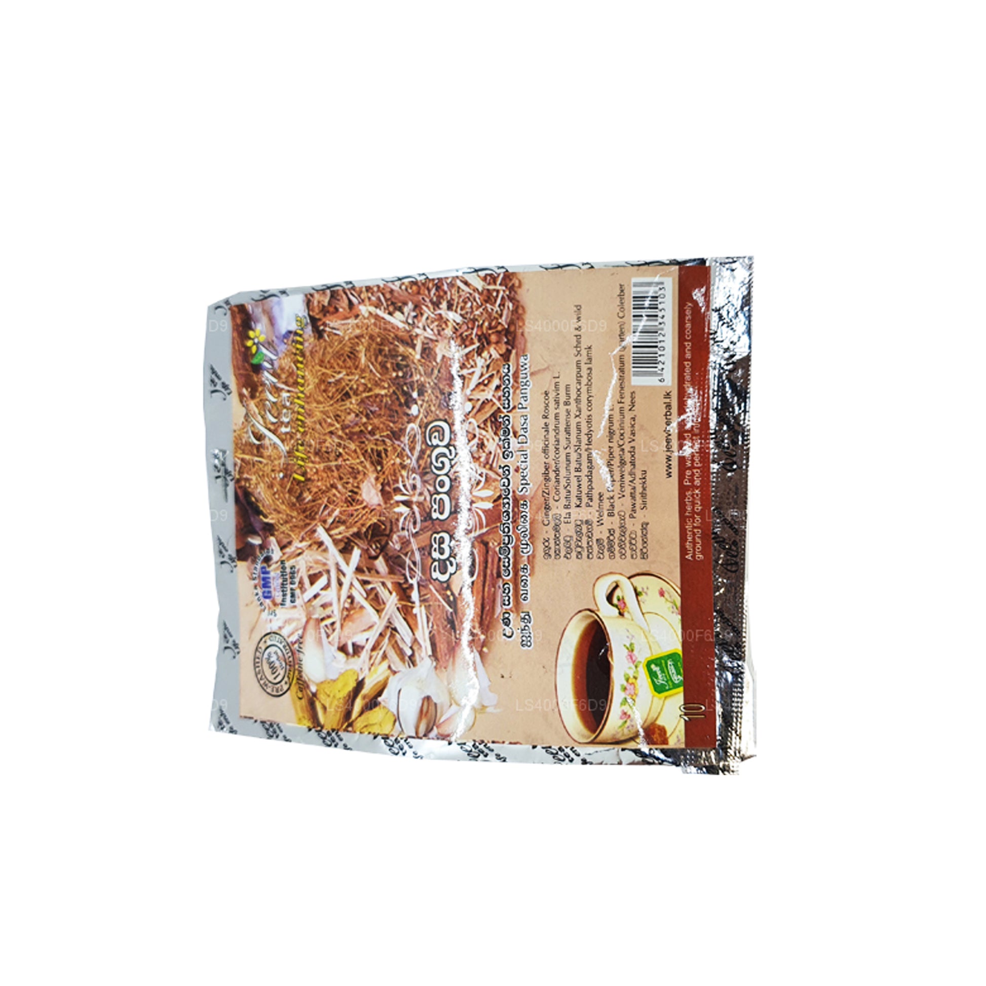 (SKU: LS4000F6D9) ”Jeevi Dasapanguwa - Ten Mix” är en örtblandning från Sri Lanka, som innehåller tio olika örter som traditionellt används i ayurvedisk medicin. Det tros erbjuda matsmältnings-, avgiftande och immunförstärkande fördelar och konsumeras vanligtvis som te eller avkok. Även om det värderas i traditionell praxis, är det lämpligt att konsultera en sjukvårdspersonal före användning.