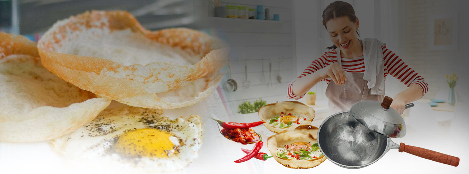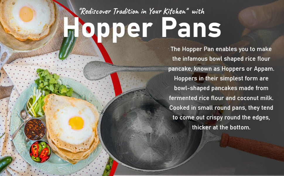 Den srilankesiska Hoppern är en typ av pannkaka i skålform, som är gjord med ett enkelt men gammalt recept på jäst rismjöl och kokosmjölk. Känd även som Appam i några andra kulturer, har hoppers varit en stapelvara i srilankesiska hushåll och vissa asiatiska länder i århundraden. Lakpura Aluminium Hopper Panna med ett lock kommer med ett lätt grepphandtag och en spatel som gör det enkelt att hälla i risblandningen och ta bort den krispiga pannkakan som ett proffs. Hopperblandningen droppar till mitten och gör den tjockare i botten och krispig runt kanterna. Hoppers njuts med kryddig curry, lök- och torkad fisk-sambol och även som ägg-hoppers, vilket är en favorit bland lokalbefolkningen.