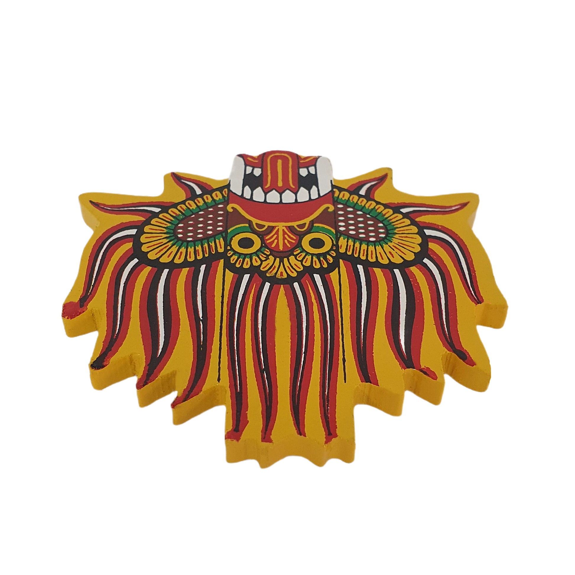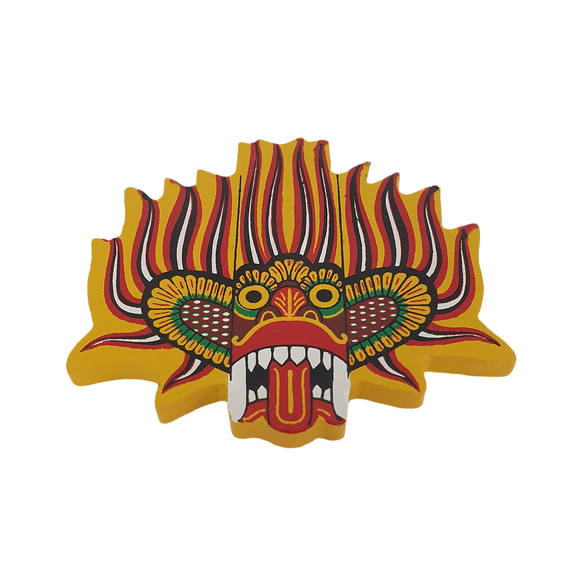Ginidal Raksha Mask Kylskåpsmagneten är en livfull representation av en av Sri Lankas traditionella Raksha-masker, som symboliserar skydd och styrka. Ginidal Raksha-masken, känd för sitt starka uttryck och färgglada detaljer, tros driva bort negativa energier och bringa lycka. Denna miniatyrversion är tillverkad med omsorg och uppmärksamhet på detaljer och fångar det srilankanska hantverkets konstnärliga förmåga. Designad som en kylskåpsmagnet kombinerar den kulturarv med vardaglig funktionalitet, vilket gör den till en meningsfull souvenir eller dekorativt tillskott till ditt hem eller din arbetsplats.