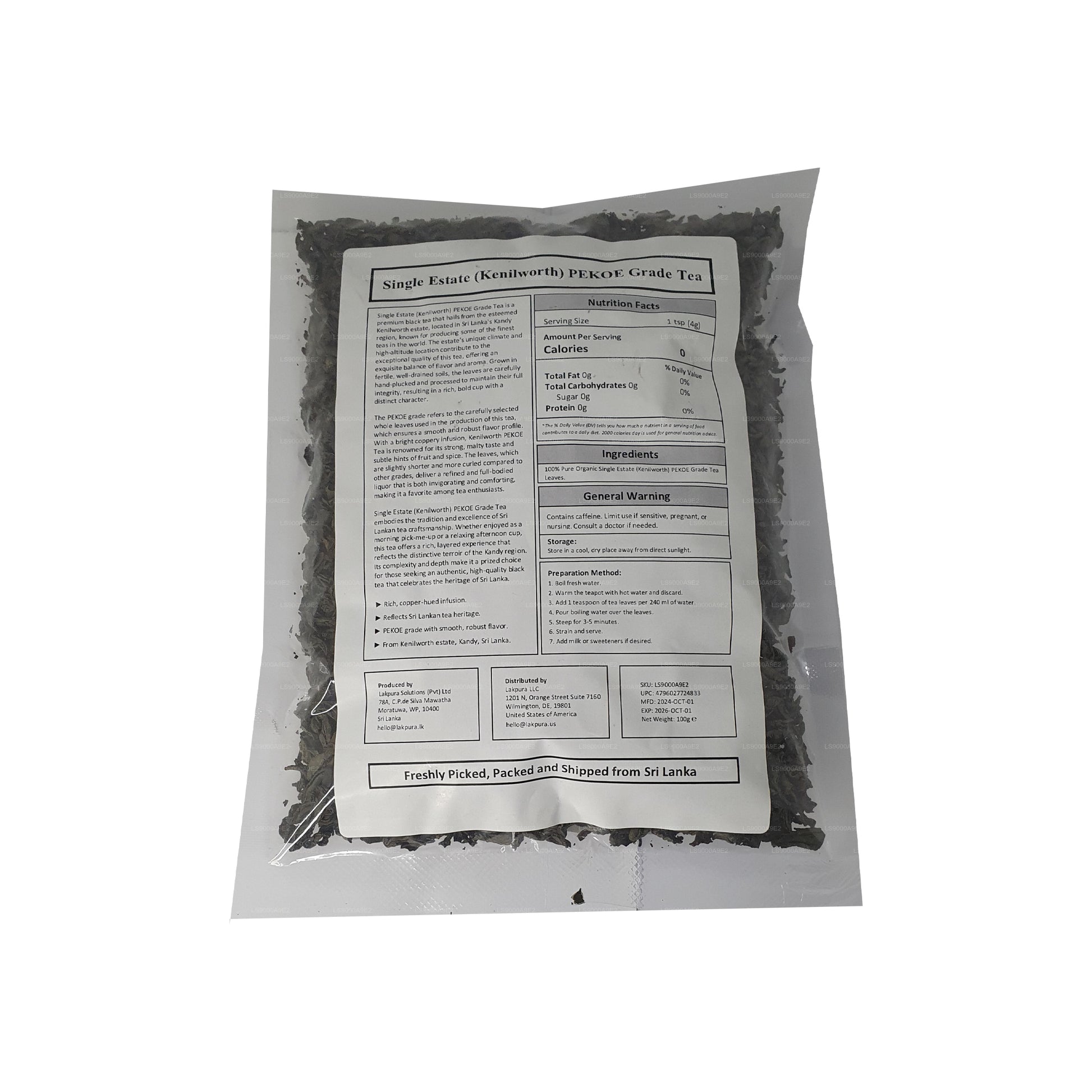 Lakpura enda egendom (Kenilworth) PEKOE Grade Ceylon svart te (100g)