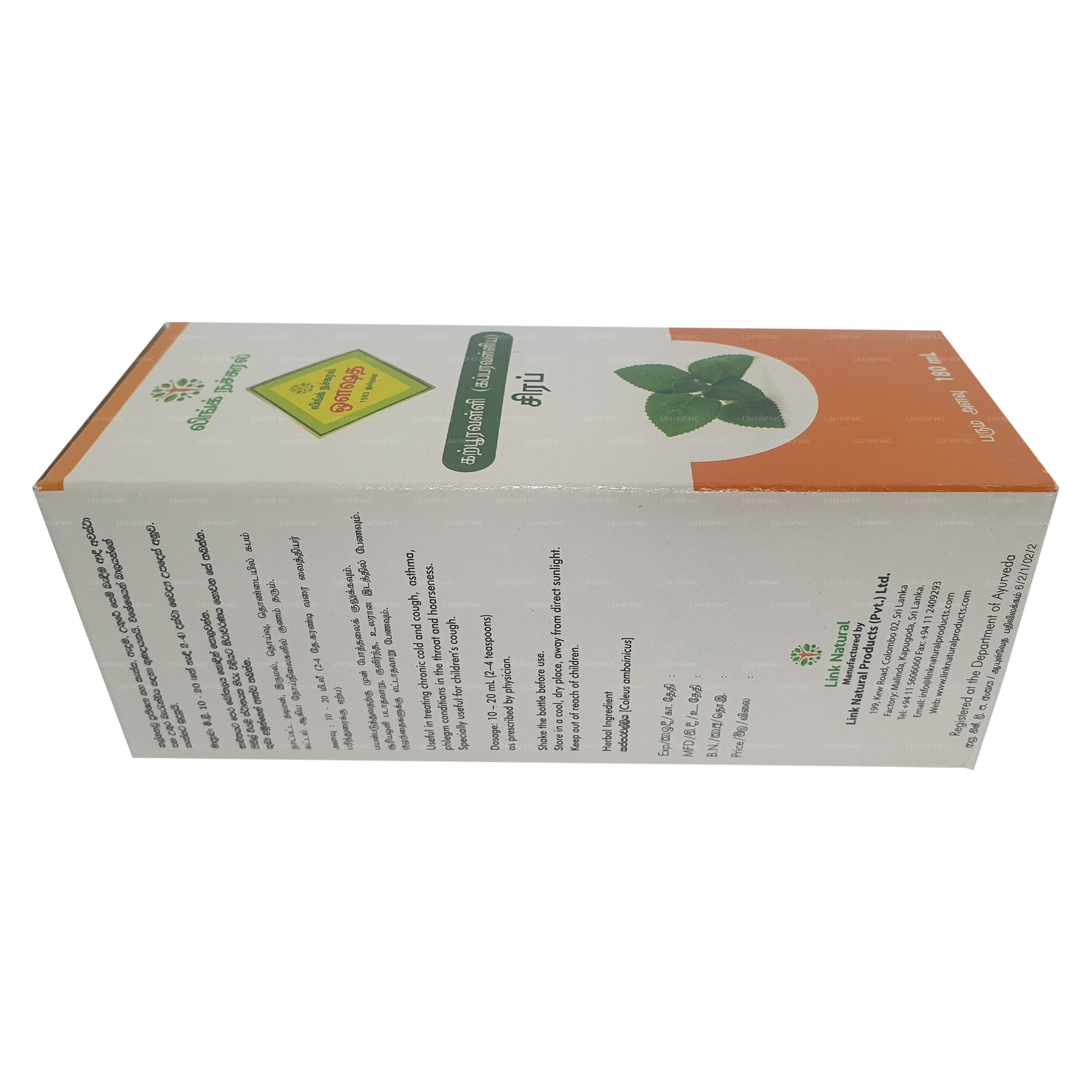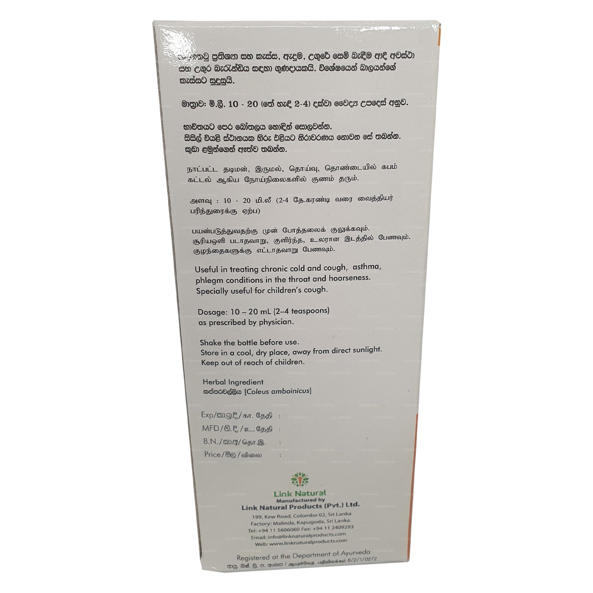 (SKU: LS4180F44C) Kapparawalliya Sirap är ett botemedel mot kronisk hosta, bronkialastma, katarrinfektioner hos barn och kikhosta.