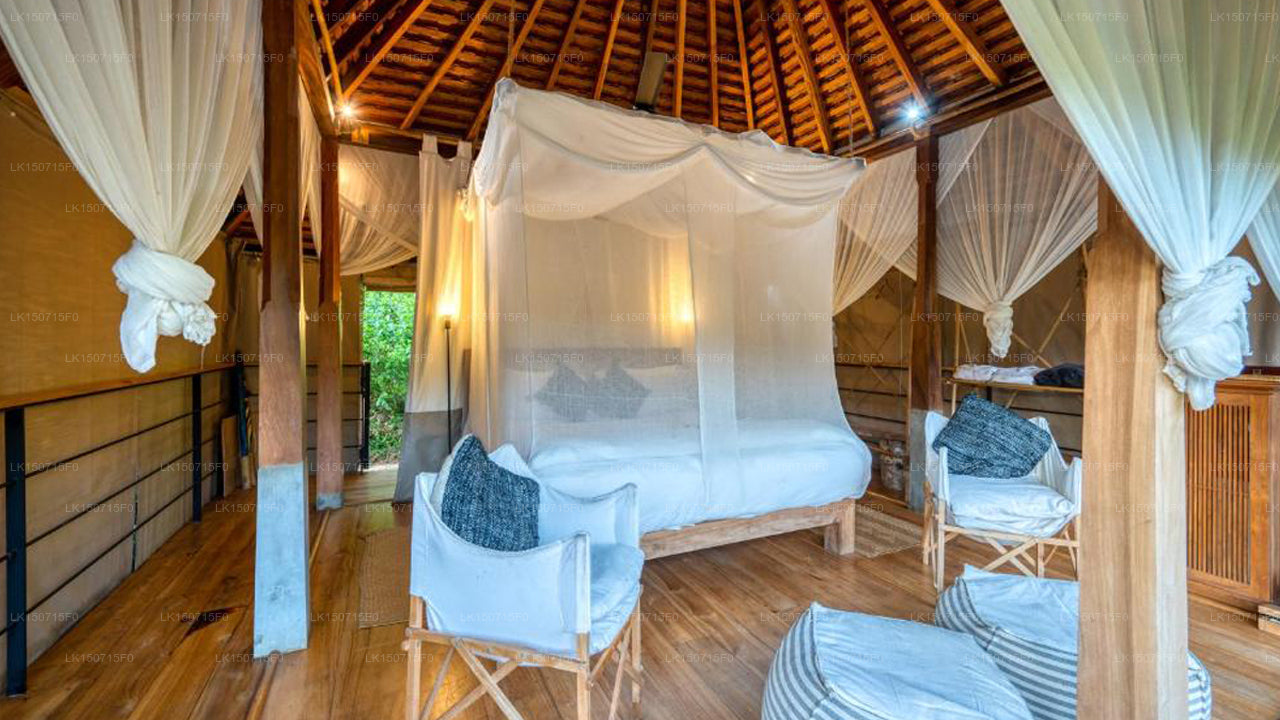 The resort features nine uniquely designed suites that blend traditional Sri Lankan architecture with modern comforts. Options include luxury villa suites with private courtyards and plunge pools, as well as forest pavilions constructed from local timber, offering semi-open walls for an immersive nature experience. All rooms are furnished with antiques and provide views of the surrounding forest or paddy fields.