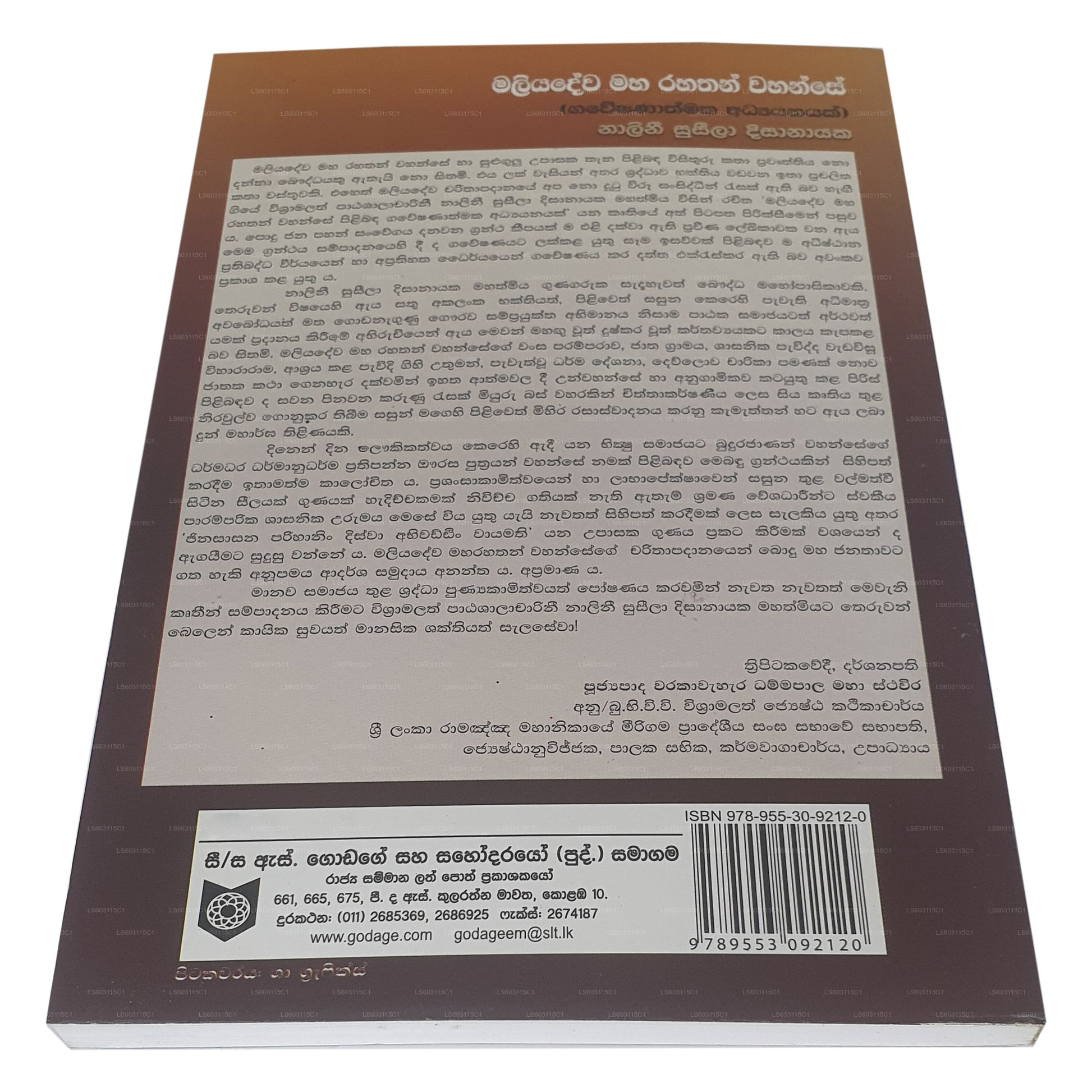 | Description | Maliyadewa Maha Rahathan Wahanse(Gaweshanathmaka Adyanayak) by Nalini Susila Disanayake |