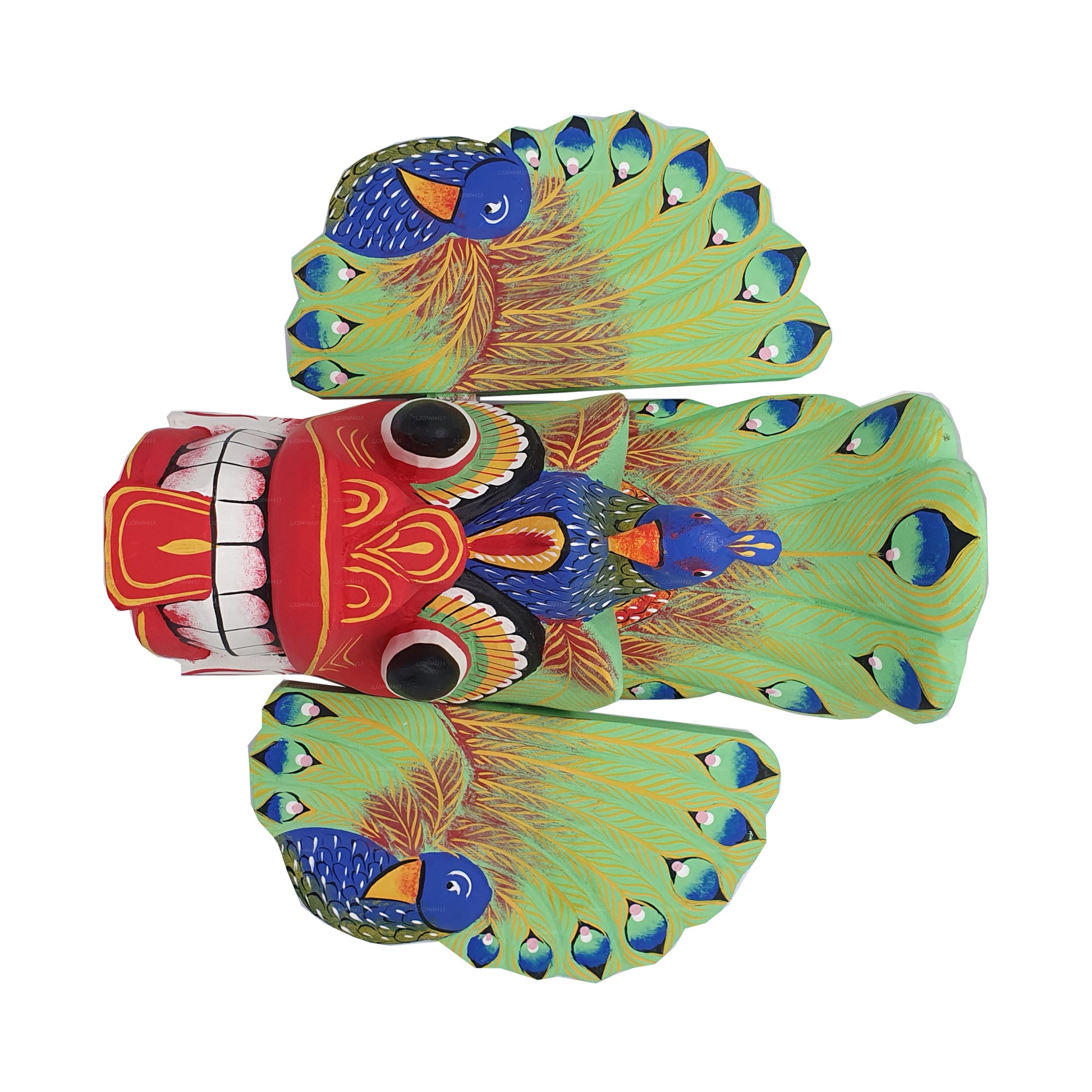 (SKU: LS2040F3BA) Sri Lankas traditionella mask Mayura Raksha (Peacock Devil) Mask är känd för att ge fred, rikedom och välstånd till ditt hus, företag eller egendom medan du avvärjer onda andar. Dessa färgglada och eleganta masker gjordes av vår konstnär som är en av de sista i sin generation som är geni i detta mästerverk. Detta görs noggrant genom att snida ”Diya Kaduru” trä och målade med traditionella färger. Detta är en premiumkvalitetsprodukt.