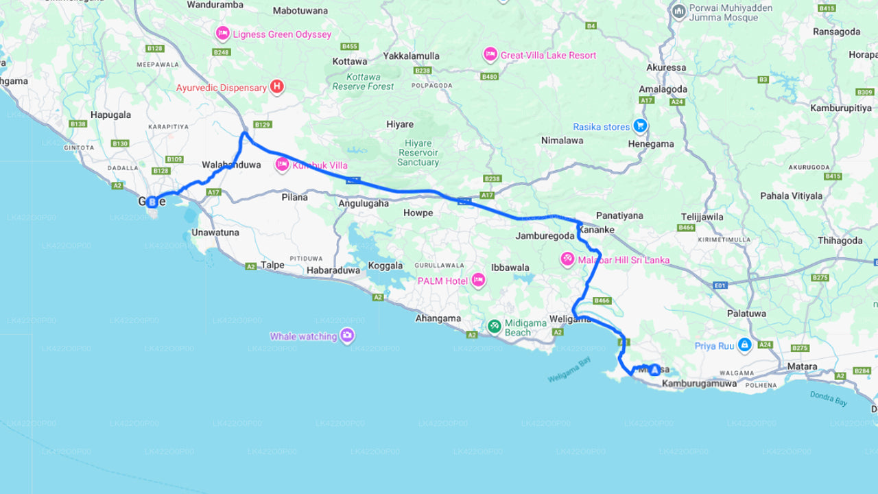 - Pick-up within the city limits of Mirissa and drop-off within the city limits of Galle.