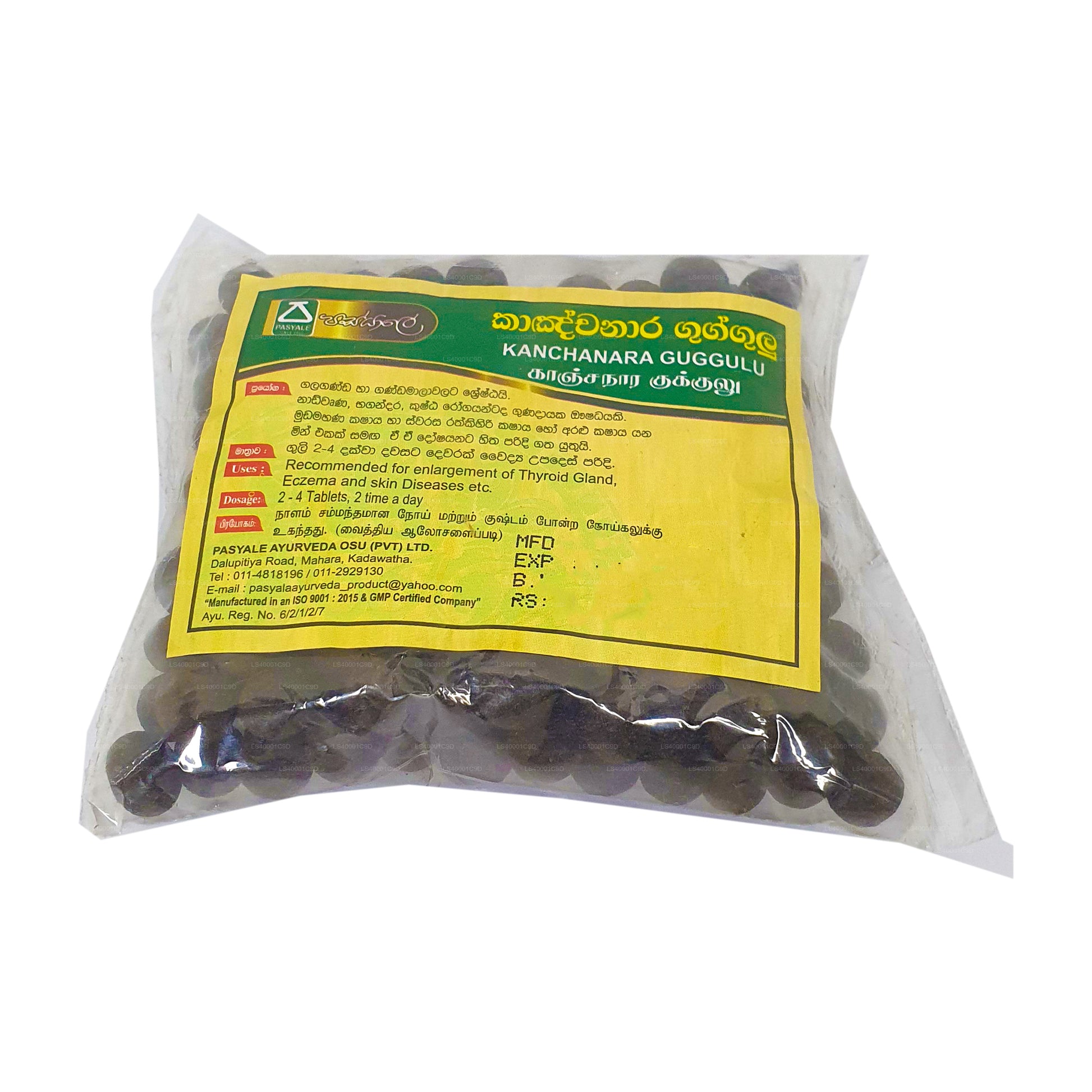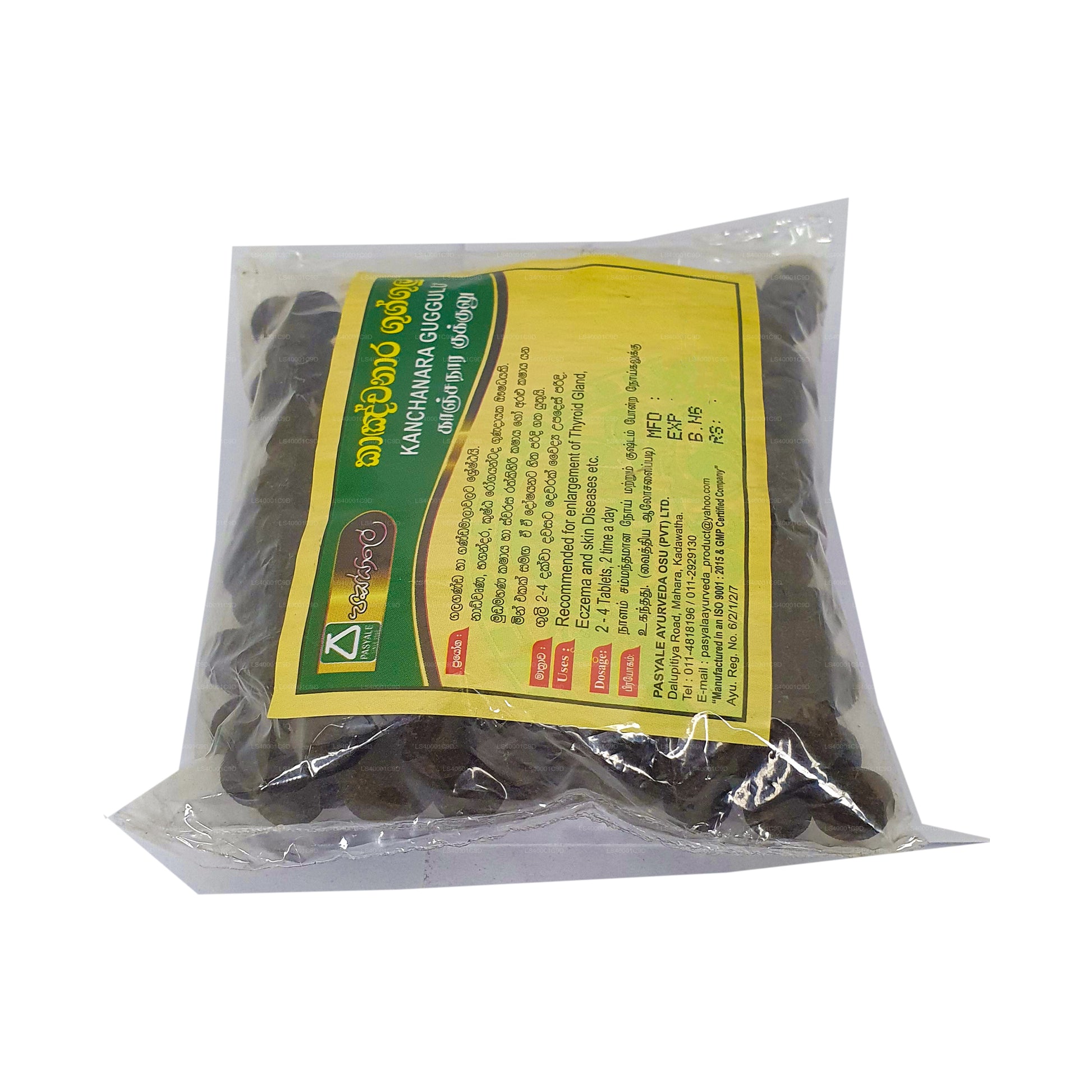 Pasyale Kanchanara Gugglu is a traditional Ayurvedic herbal supplement. It is formulated with Kanchanara, an herb known for its potential benefits in supporting thyroid health and metabolism. Gugglu refers to the resin of the Commiphora Mukul tree, which is also used in Ayurveda for various health purposes. This supplement combines these natural ingredients to create a product that might aid in promoting thyroid balance and overall wellness. As with any herbal supplement, it's recommended to consult a healthcare professional before use, especially if you have any underlying health conditions or are taking other medications.)