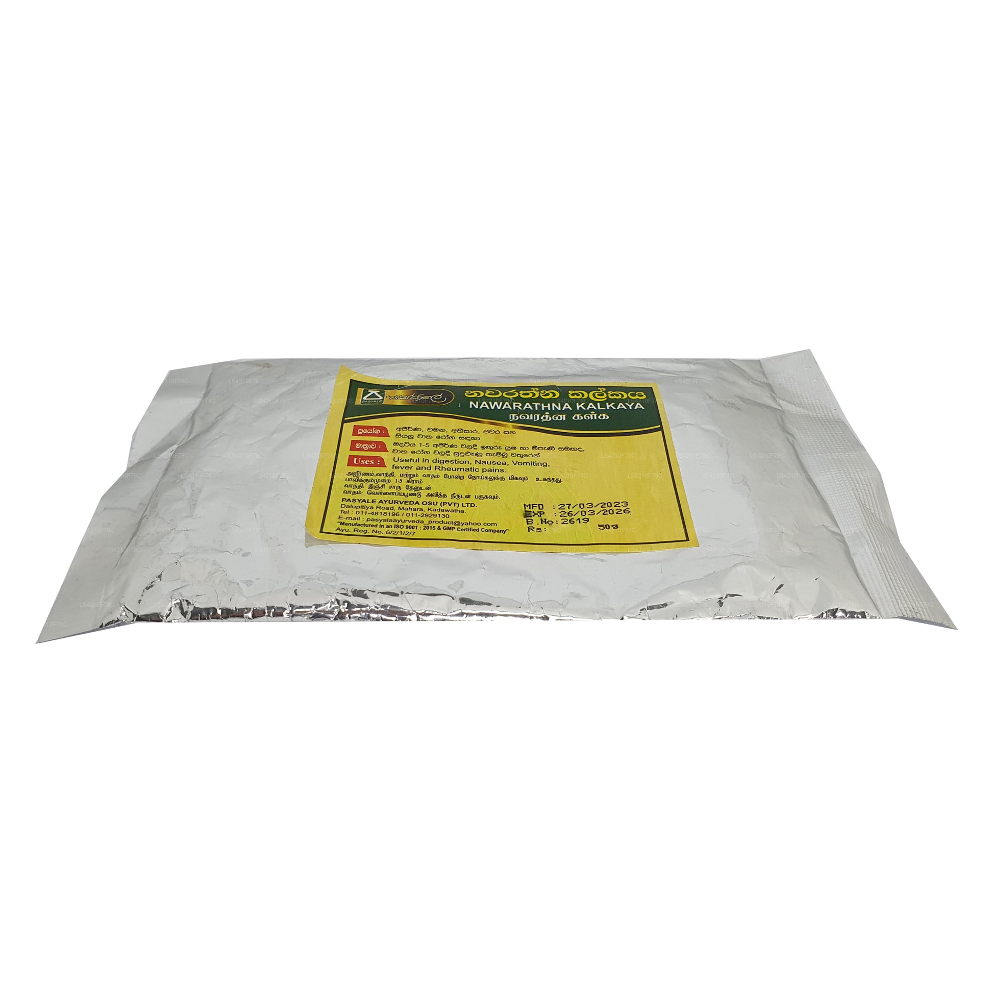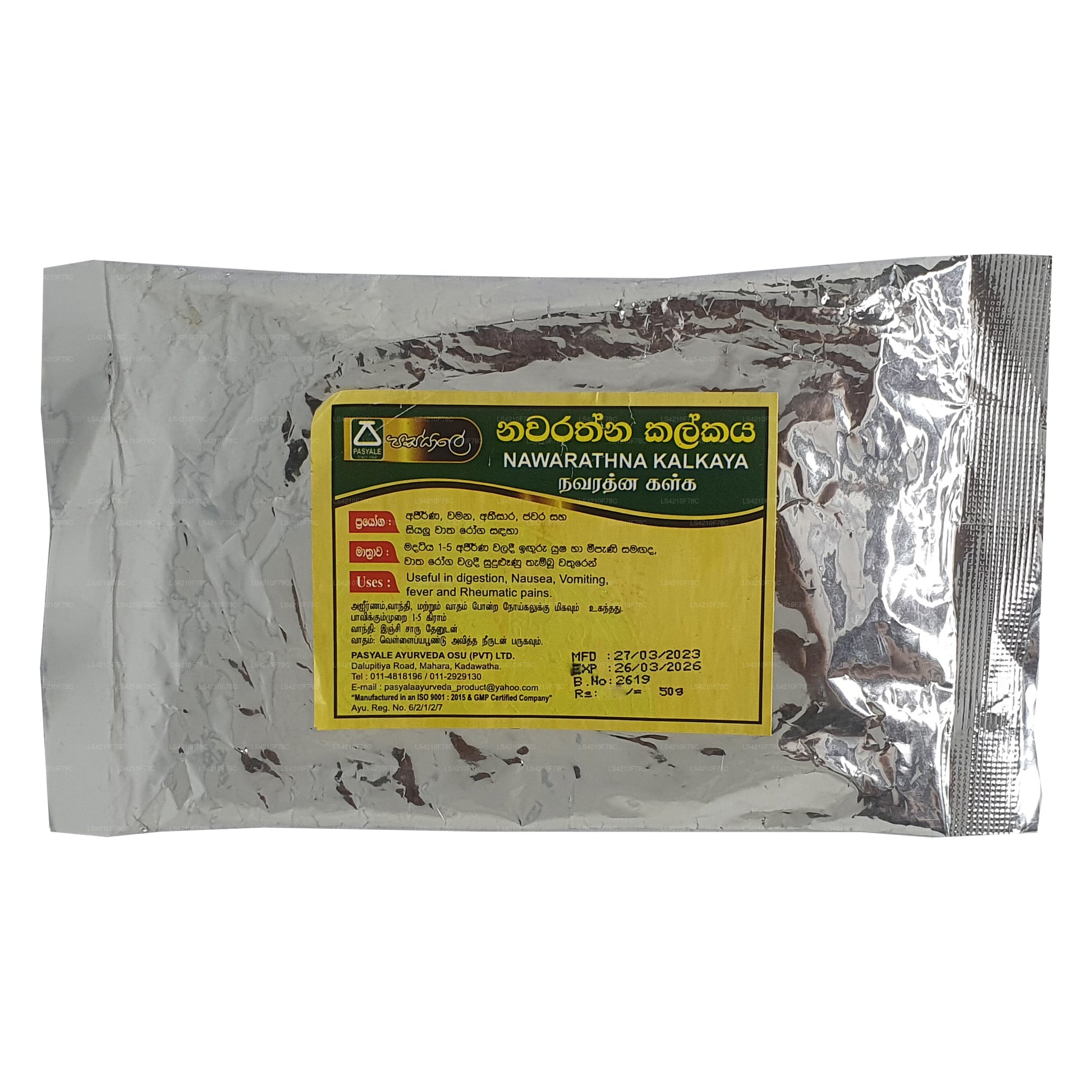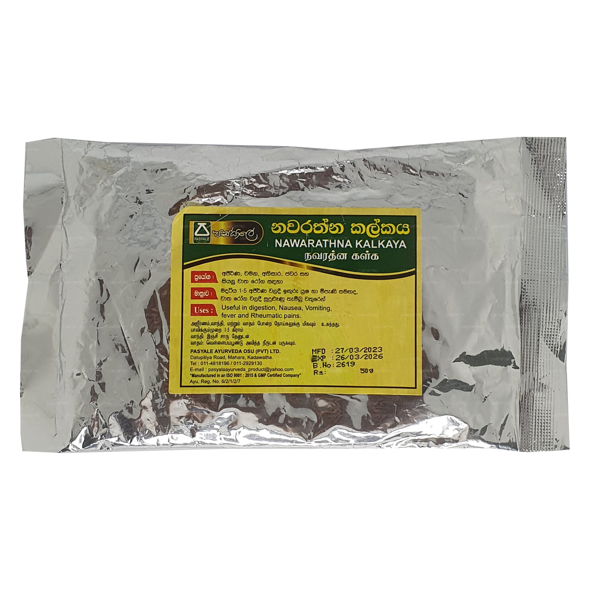 Ingredienser: Trachyspermum, (Carum Carvi) Asamodagam, Eugenia caryophyllata, (kryddnejlika) Karabu neti, Glycyrrhiza glabra (Wel mee), Picrorhiza glabra (Katukarosana), Nigella sativa (Kaluduru), Cuminum Cyminum (kumminfrö) Suminum Duru, bin honung (Mee pany)
