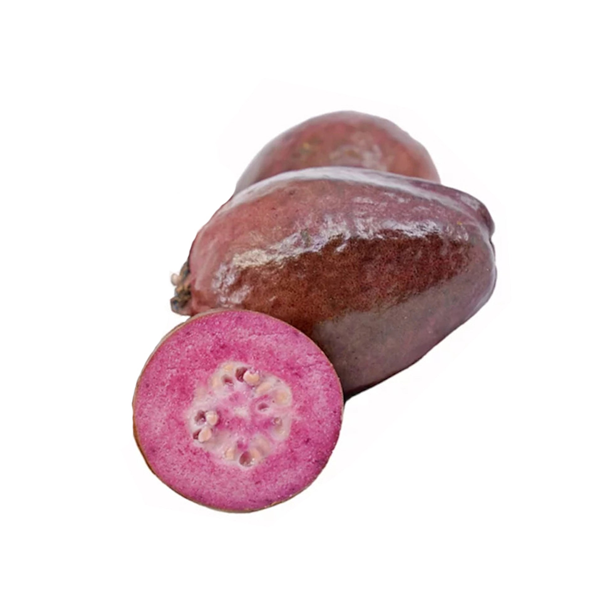 Lakpura Purple Guava Fruit Plant (Purple Kullaan Guava) är en kompakt och sällsynt sort av Psidium guajava uppskattad för sina livfulla purpurfärgade frukter och hanterbara storlek. Idealisk för små trädgårdar eller krukor, denna dvärgguavaväxt växer vanligtvis upp till 2—3 meter i höjd och trivs i varma, tropiska klimat med fullt solljus och väldränerad jord. Frukterna, när de är mogna, har sött, aromatiskt kött i nyanser av rosa till djuplila och är rika på vitamin A och C, antioxidanter och fiber. Med regelbunden beskärning och skötsel erbjuder denna dekorativa men ändå produktiva växt både visuellt tilltal och läckra skördar, vilket gör den till ett utmärkt komplement till alla fruktälskares samling