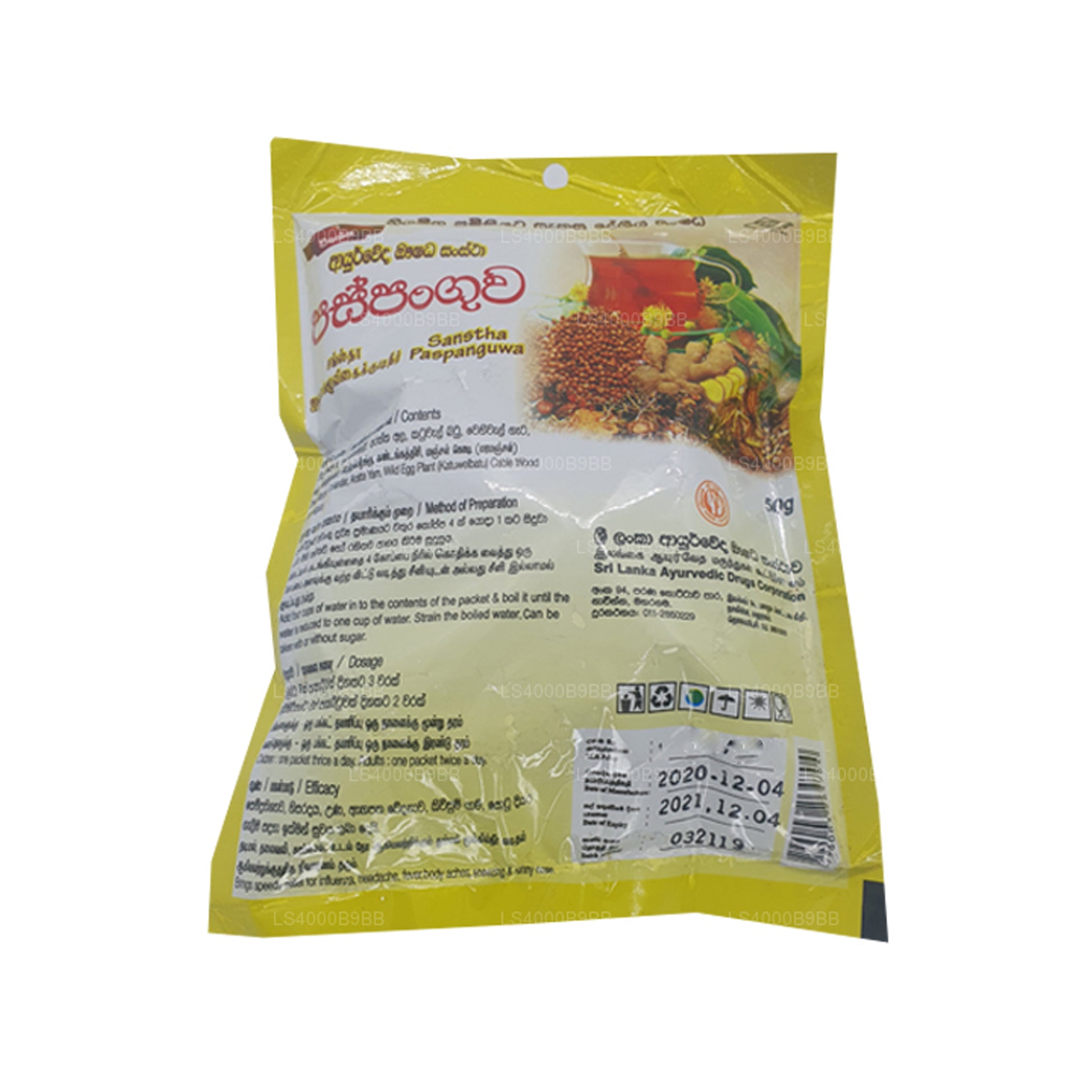 (SKU: LS4000B9BB) SLADC Paspanguwa (50g) gjord av torkad ingefära, koriander, Aratta Yam, Wild Egg Plant (Katuwelbatu) kabel trä, Weniwel Gata. Ger snabb lindring för influensa, huvudvärk, feber kroppsvärk, nysningar och rinnande näsa.
