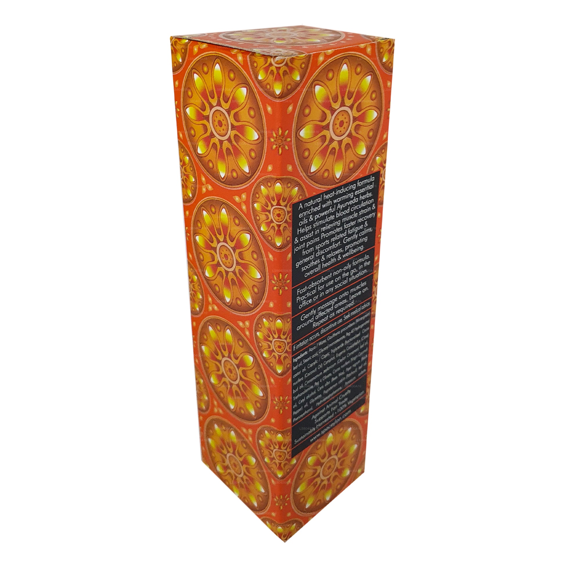 En naturlig värmeinducerande formula berikad med värmande eteriska oljor & kraftfulla ayurveda örter. Hjälper till att stimulera blodcirkulationen och hjälpa till att lindra muskelbelastning och ledvärk. Främjar snabbare återhämtning från sportrelaterad trötthet och allmänt obehag. Lugnar försiktigt, lugnar & slappnar av, främjar allmän hälsa och välbefinnande.