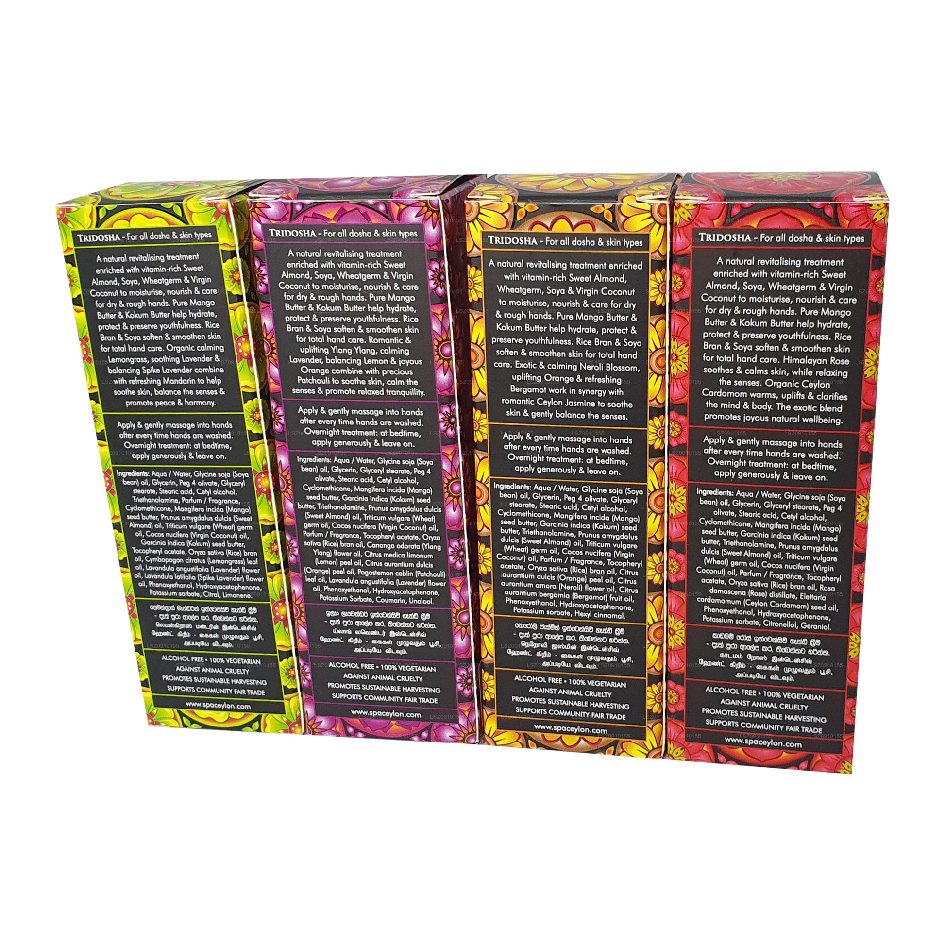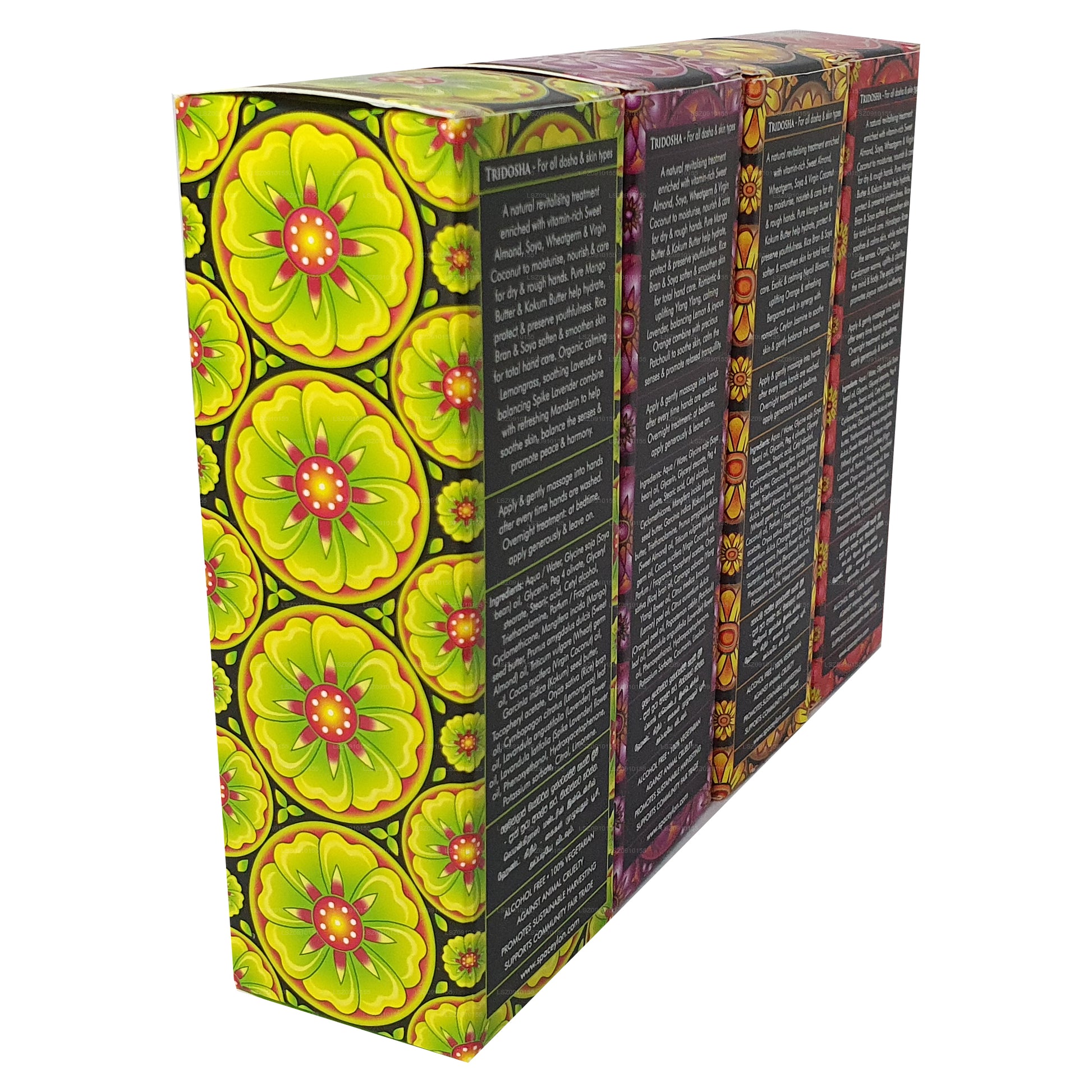 Detta lyxiga set innehåller fyra exotiska handkrämer berikade med ayurvediska örter, naturliga fruktsmör och certifierade ekologiska eteriska oljor, utformade för att ge näring, återfukta och vitalisera torra, grova händer. Perfekt för daglig användning eller som en behandling över natten, krämerna ger ungdomlig, strålande hud och passar alla doshas och hudtyper