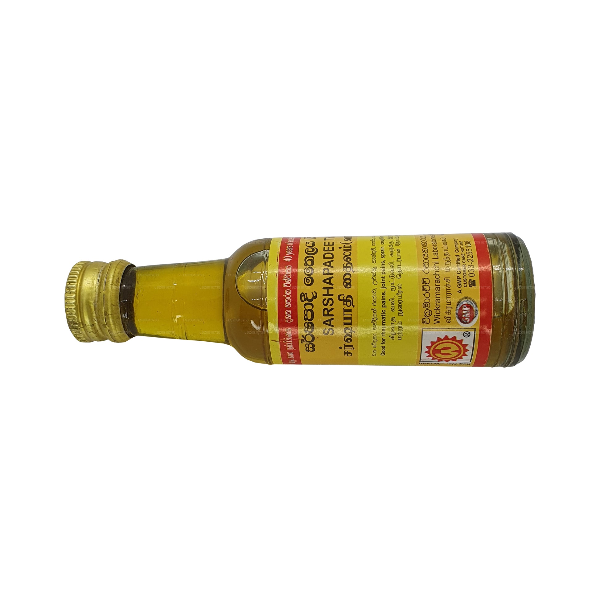 (SKU: LS40005D57) Wickramarachchi Labs Sarshapadi Thailaya är en traditionell ayurvedisk medicinsk olja med en bas av senapsolja infunderad med olika örter och botaniska extrakt. Det är utformat för att ge lättnad för tillstånd som astma, lunginflammation och svullnad på grund av olyckor eller reumatiska klagomål. Oljan appliceras topiskt och kan hjälpa till med andningsproblem, minska inflammation och främja det allmänna välbefinnandet